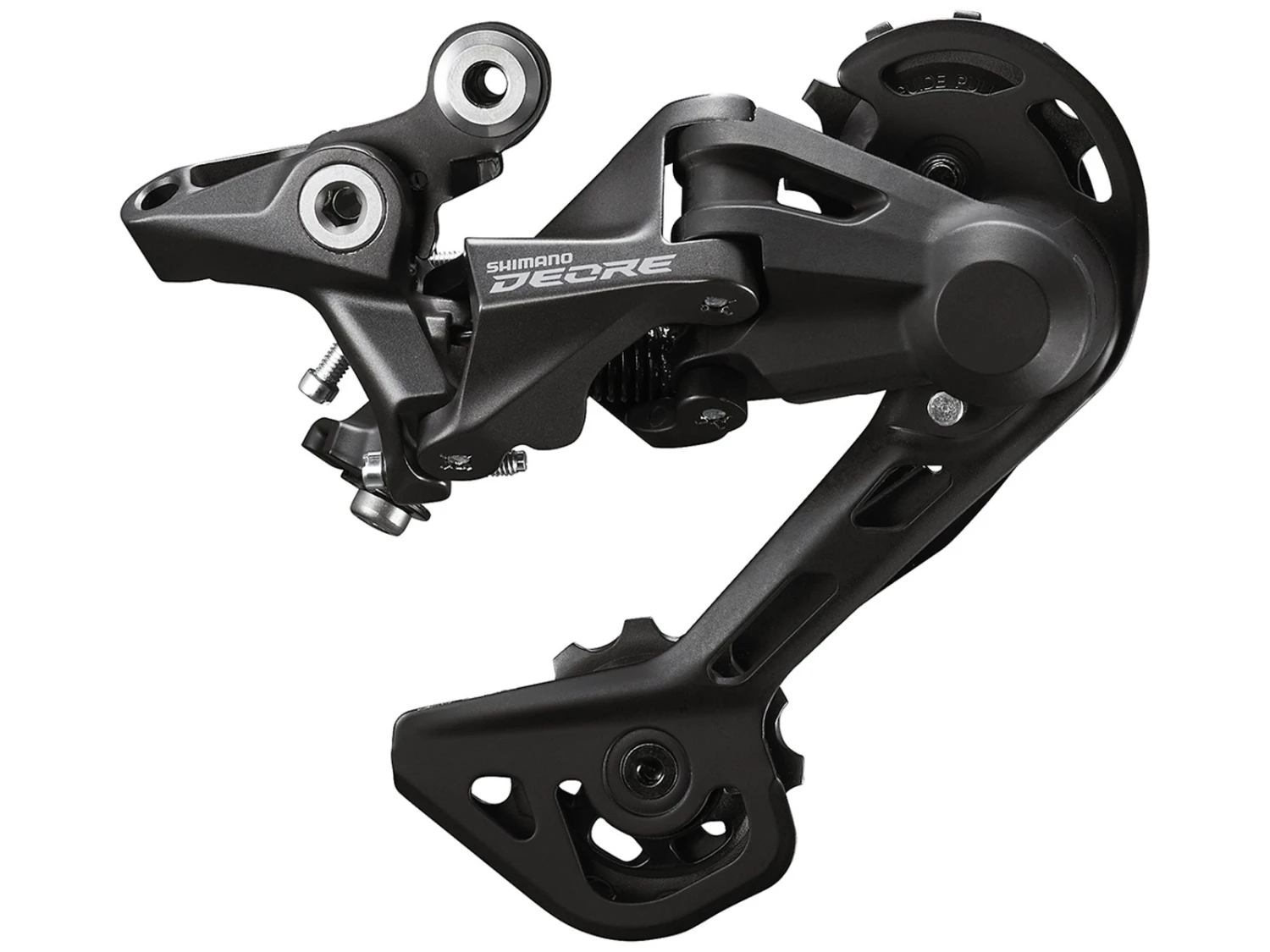Le dérailleur arrière SHIMANO Deore RD-M4120 est présenté ici dans une version dotée d’une chape longue, qui convient aux transmissions 10 et 11 vitesses à double plateaux.